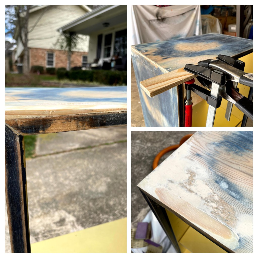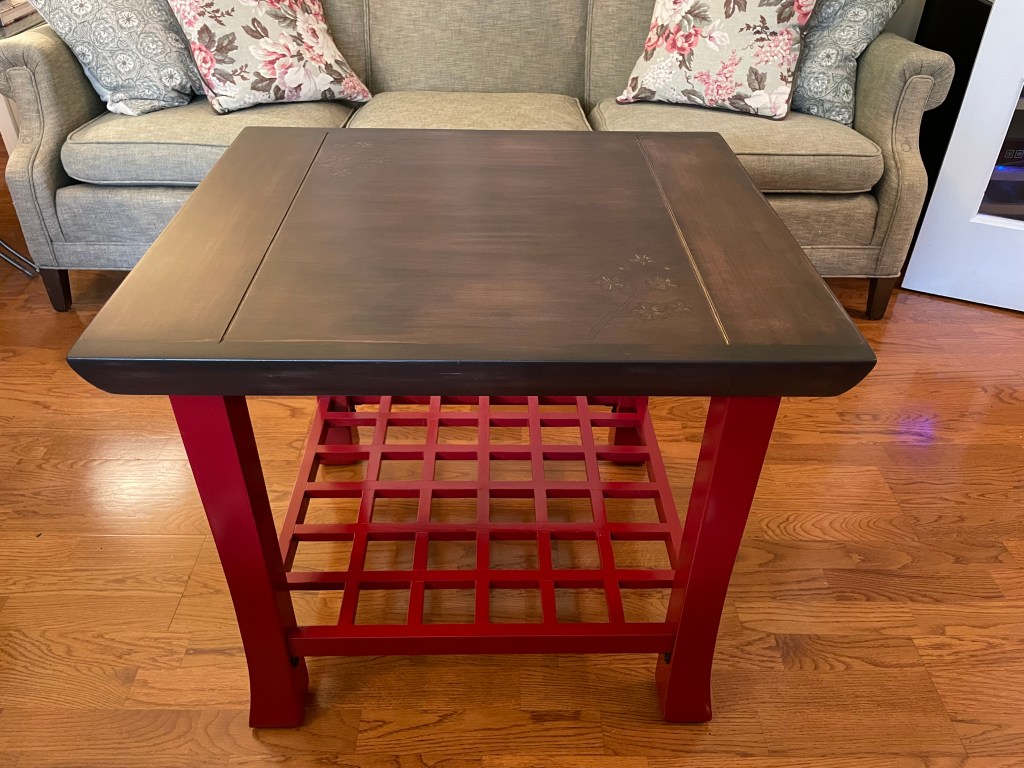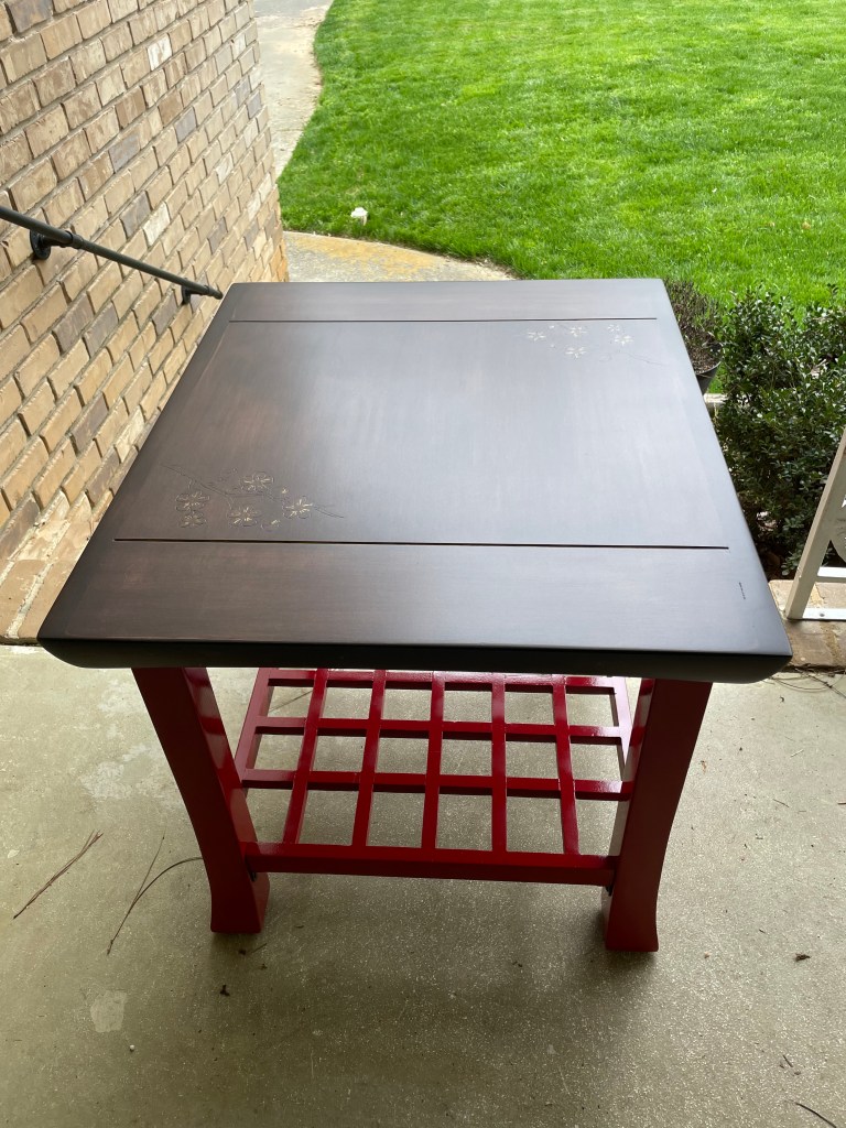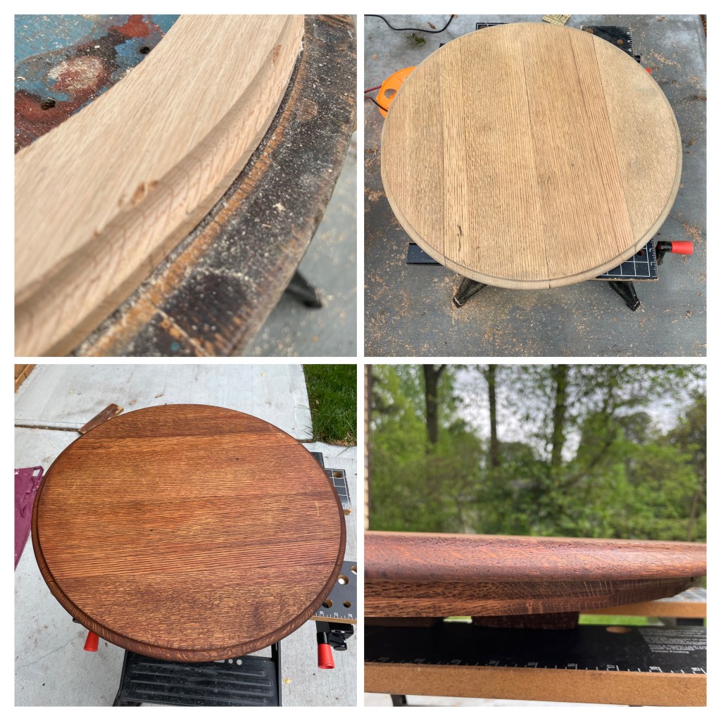 Once the table top had been repaired I routed the edge of the reinforcing wood ring, removed all the old finish and stained both the top and the new wood ring with Rust-Oleum American Walnut stain followed by Varathane Dark Walnut stain.