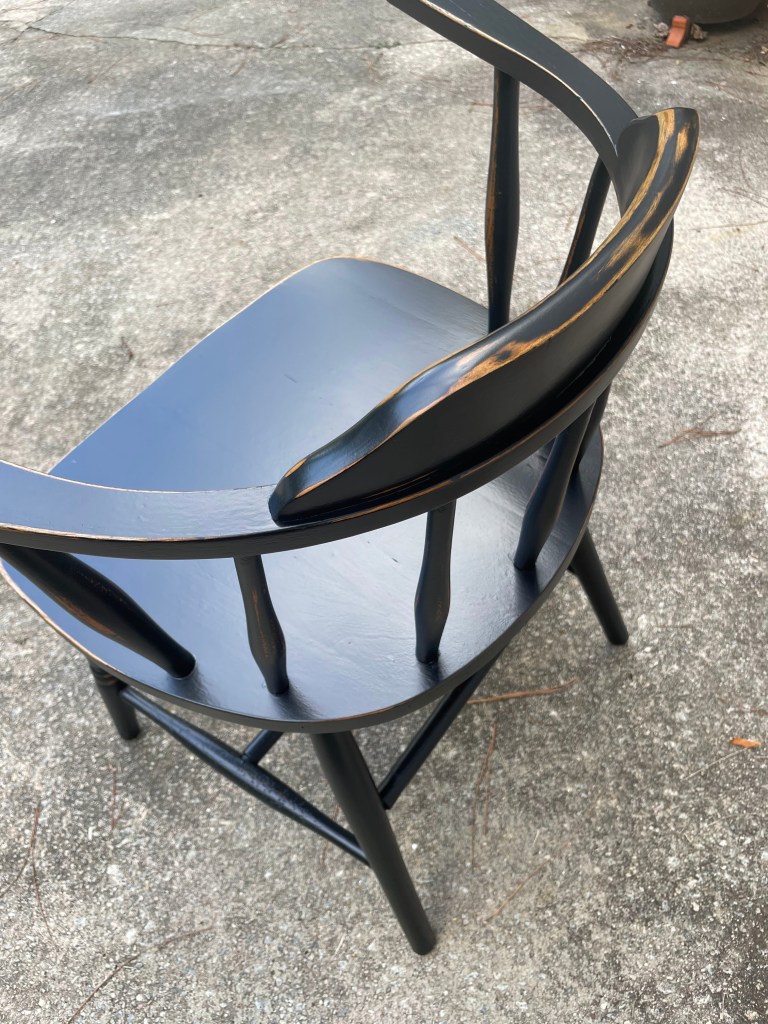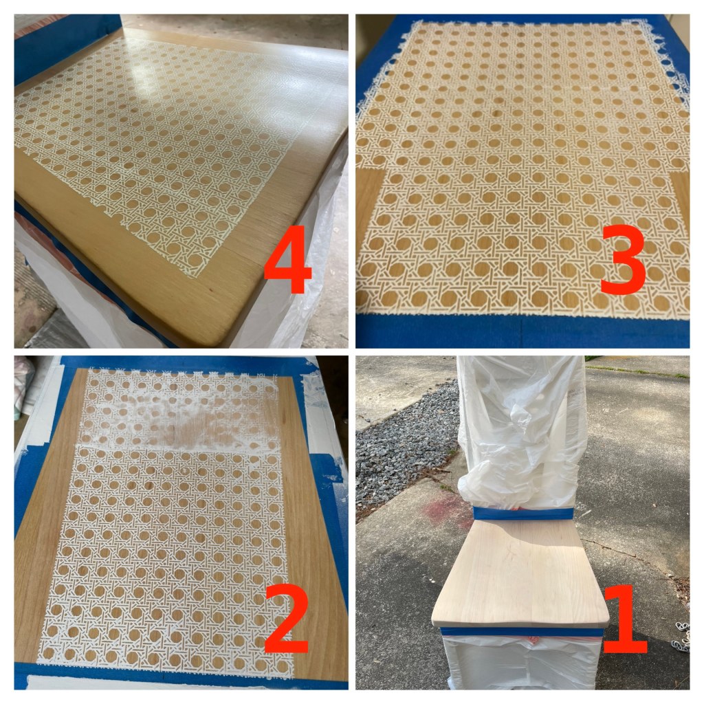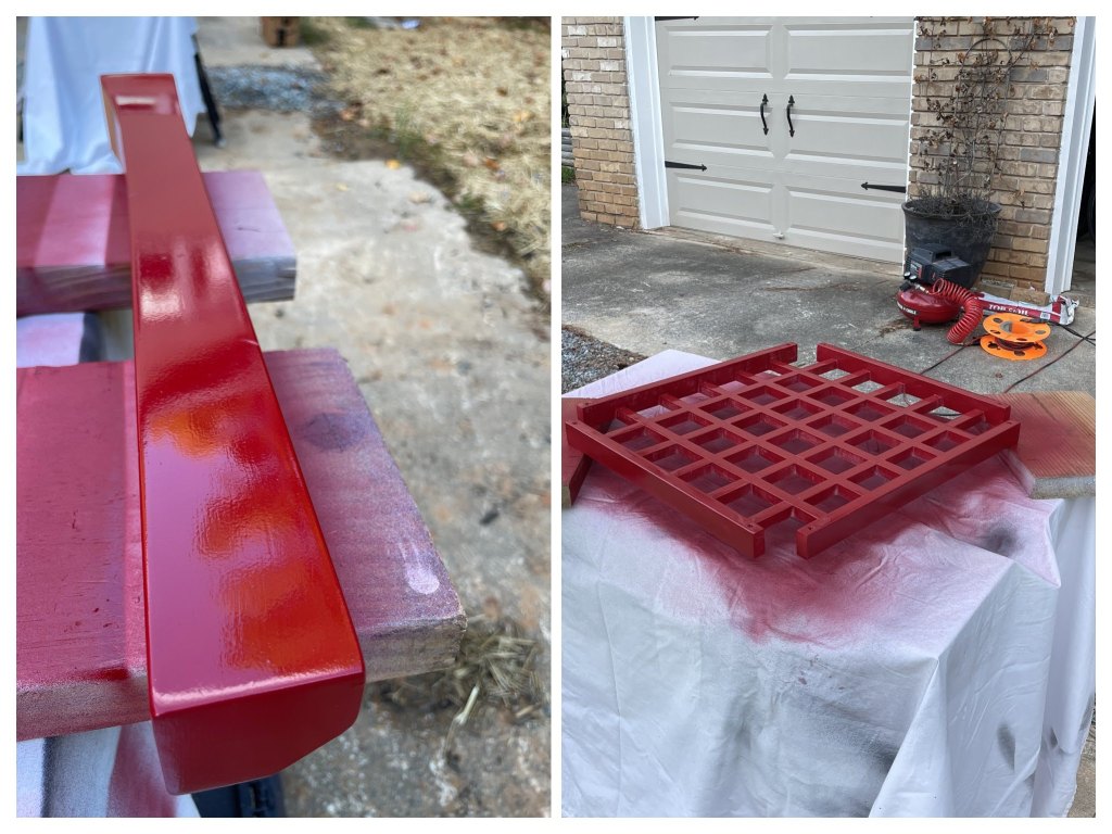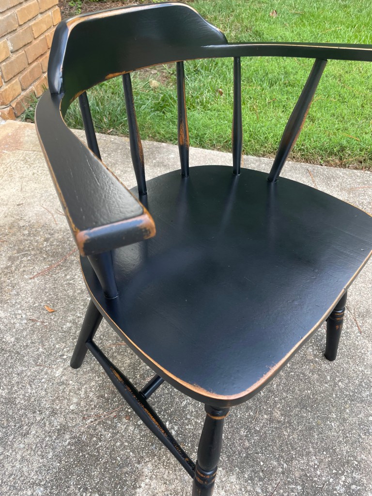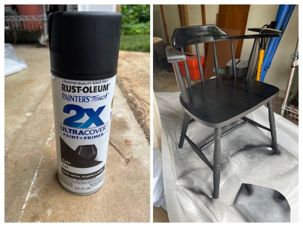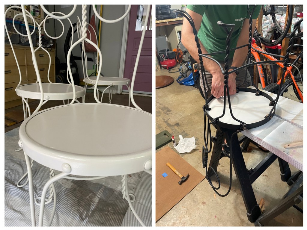With a little help from Handy Hubby I took apart the pressure-washed chairs so I could cut, prime and install new plywood seats. Next I used a product I have used before on old metalwork that had signs of rust: Rust-Oleum Rust Reformer “instantly bonds with rust and transforms it to a non-rusting, flat-black paintable surface and prevents future rust.”