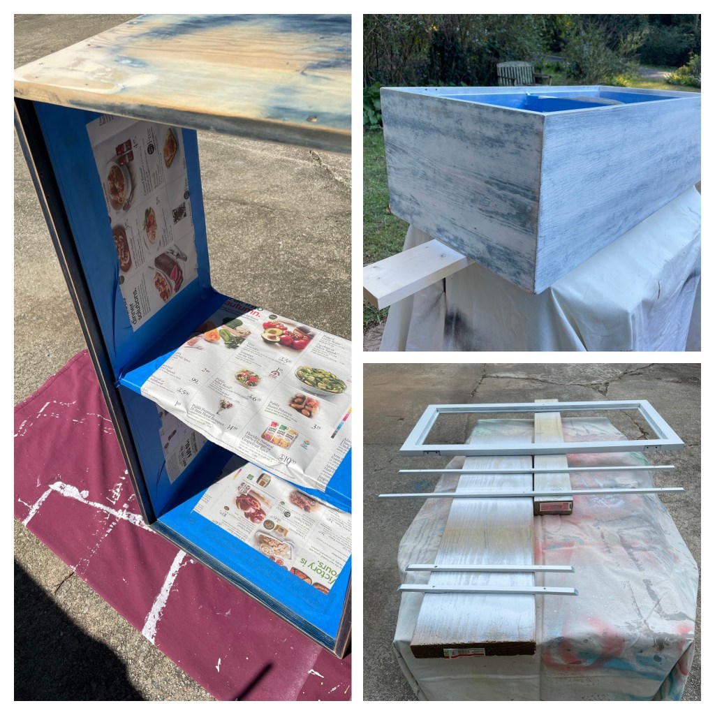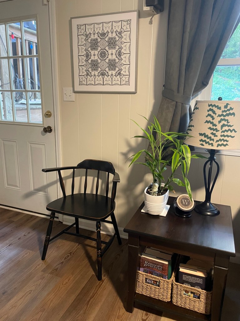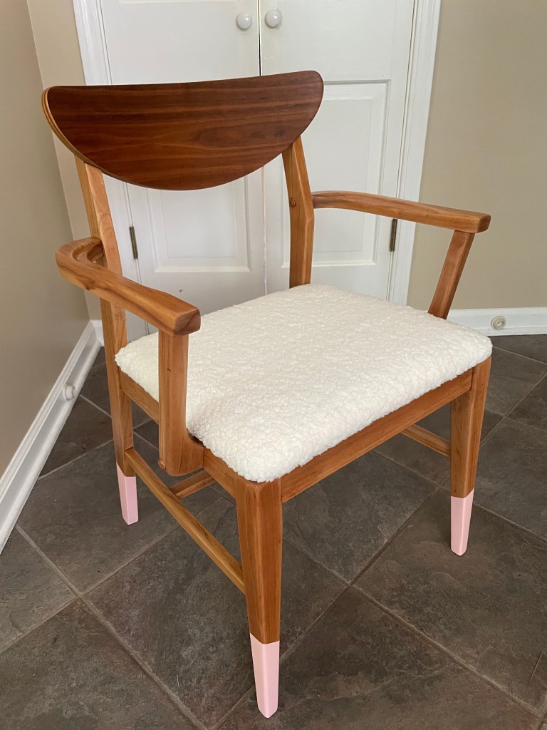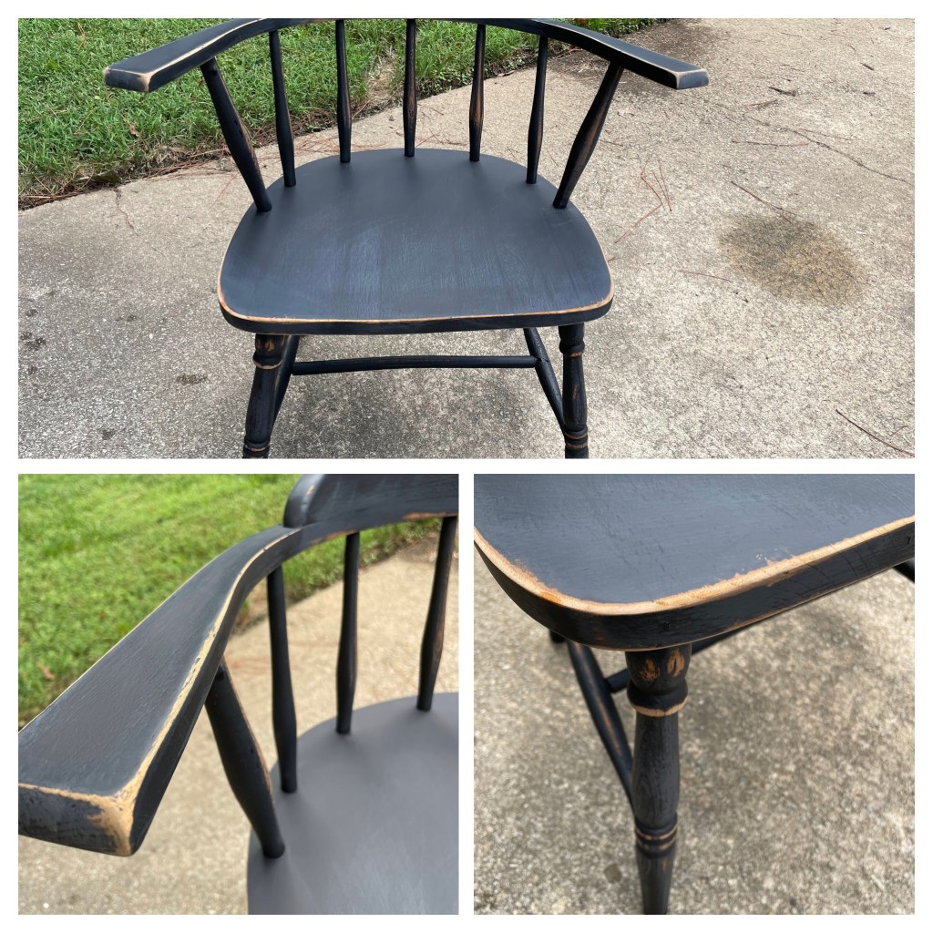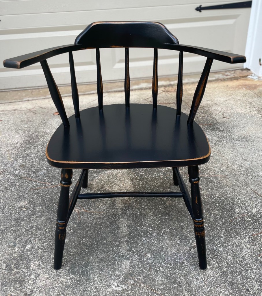 With a little help from Handy Hubby I took apart the pressure-washed chairs so I could cut, prime and install new plywood seats. Next I used a product I have used before on old metalwork that had signs of rust: Rust-Oleum Rust Reformer “instantly bonds with rust and transforms it to a non-rusting, flat-black paintable surface and prevents future rust.”