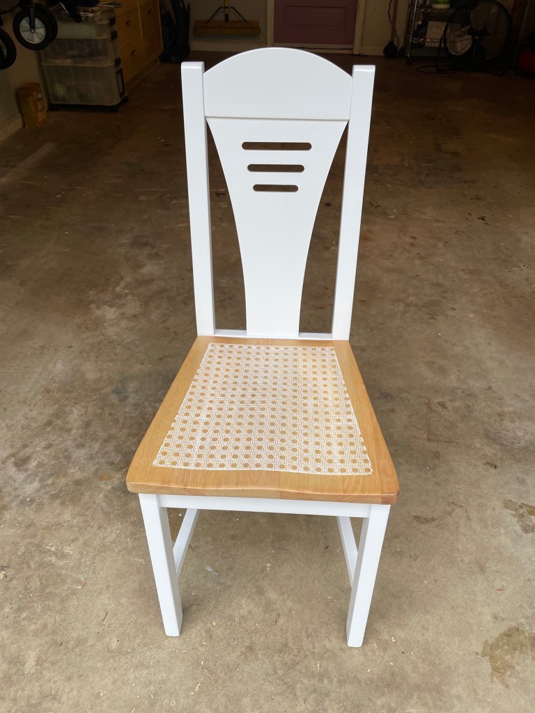 Once the chairs and table were re-assembled I applied 3 coats of Rust-Oleum Protective Enamel in shell white satin finish to all the metalwork.