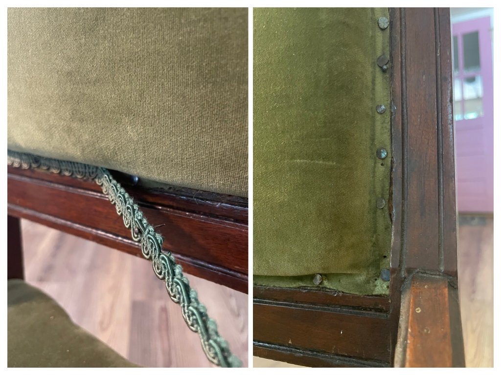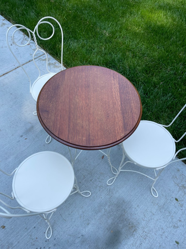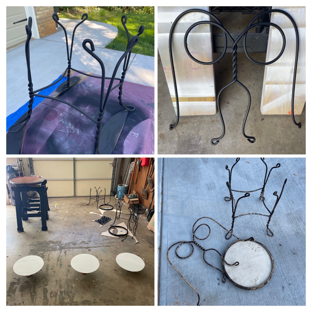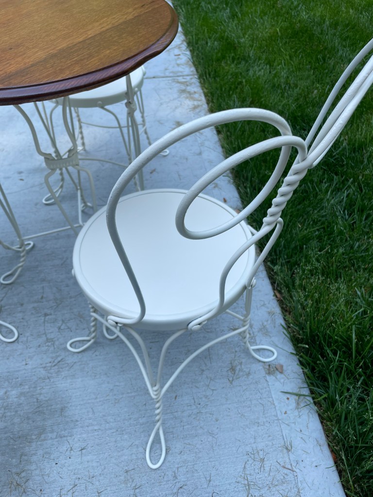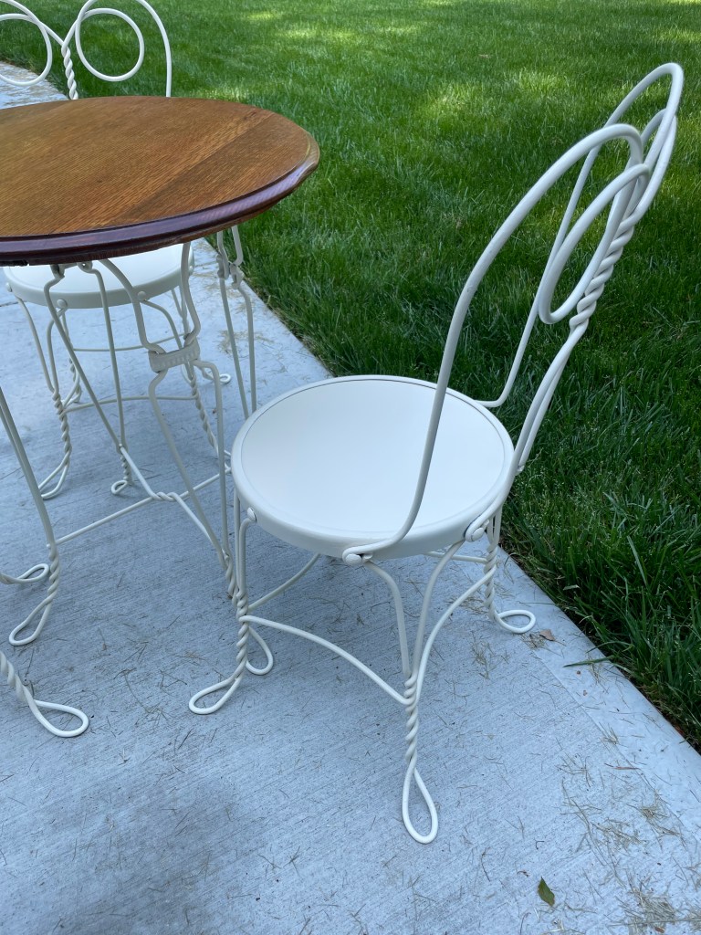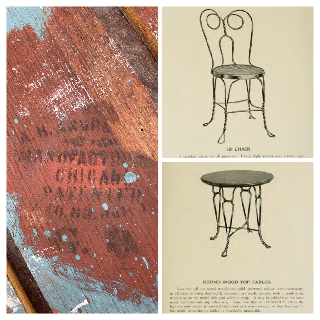 Researching the maker’s mark on the underside of the table revealed that this set was made in the late 19th-century by a company called A H Andrews of Chicago. In their catalog (where I found these images) they state that they made metal furniture for “Drug Stores, Confectioneries, Restaurants, Clubs, Billiard Parlors, Barber Shops, Shoe Stores, Offices and Reception Rooms”. This set is made of Bessemer steel and originally had a Japanese copper finish. The seats were laminated plywood and the table top was mahogany or quarter-sawn oak. When I read that another original finish option was white enamel, I knew I could paint with a clear conscience.