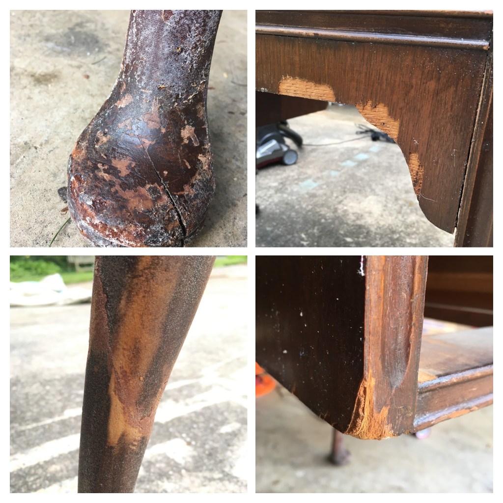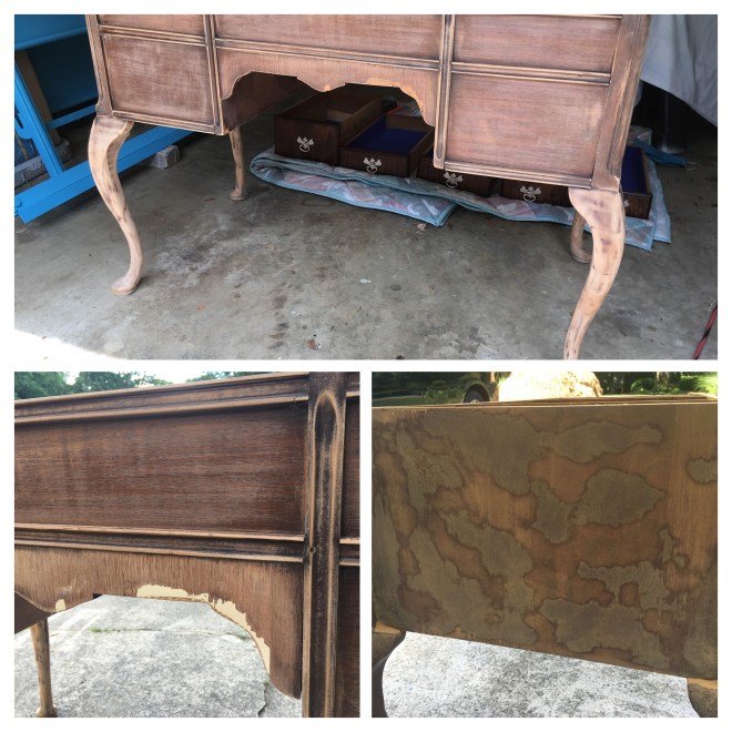 One of the first things that struck me about the chair is the bamboo-style legs, spindles, and stretchers. Since bamboo furniture often has a mid-century vibe to it, and because the existing finish was badly scuffed in places, I decided to first of all remove the dark brown glaze finish. At this point I was thinking I would maybe just restore it to its lighter, natural color.