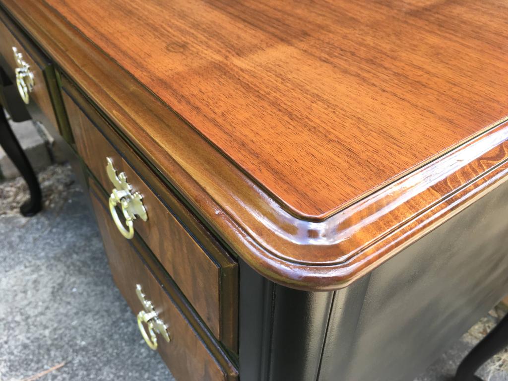 After cleaning the chair with a weak solution of Simple Green, I removed the glaze finish using Minwax Furniture Refinisher. It came off nicely and I was happy to find beautiful maple wood underneath.